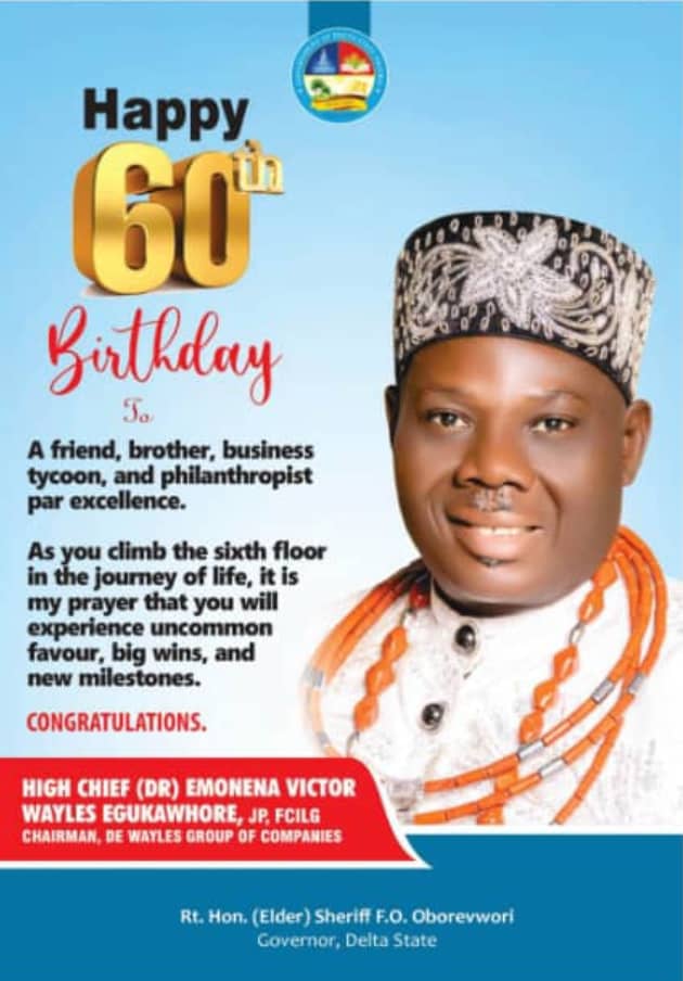 Delta State Governor, Rt. Hon. (Elder) Sheriff F. O. Oborevwori, has congratulated renowned business tycoon, philanthropist, and Chairman of De Wayles Group of Companies, High Chief (Dr.) Emonena Victor…