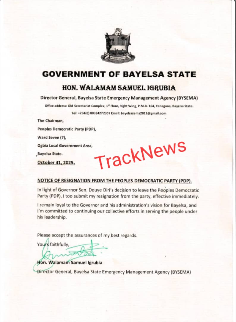 In a formal notice released on Wednesday, Igrubia stated that his resignation from the PDP takes immediate effect. He cited his loyalty to Governor Diri as the primary reason for his departure, emphasizing his commitment to continue supporting the governor’s vision and administration despite the change in political alignment.