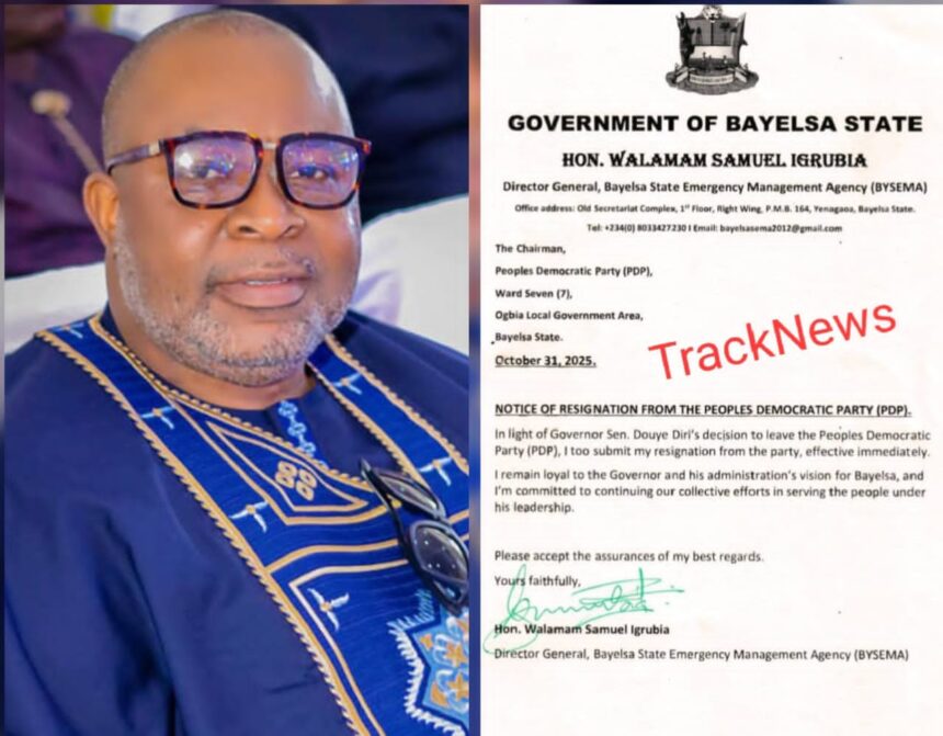 Hon. Walamam Samuel Igrubia, the Director General of the Bayelsa State Emergency Management Agency (BYSEMA), has announced his resignation from the Peoples Democratic Party (PDP). His decision comes shortly after Governor Senator Douye Diri reportedly left the party, marking a significant political shift within Bayelsa State’s ruling circle.
