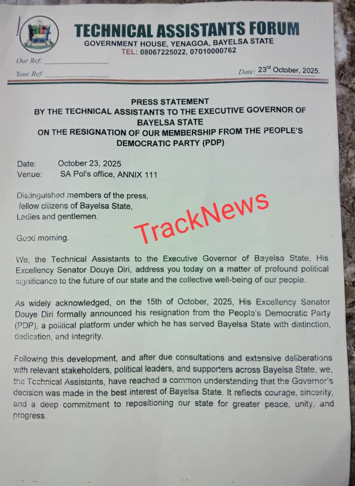 A major political shift has occurred in Bayelsa State as the Technical Assistants to Governor Douye Diri have formally announced their resignation from the People’s Democratic Party (PDP). The group made the announcement on Thursday, October 23, 2025, during a press briefing held at the Special Adviser on Political Matters’ office, Annex 111, Yenagoa.
