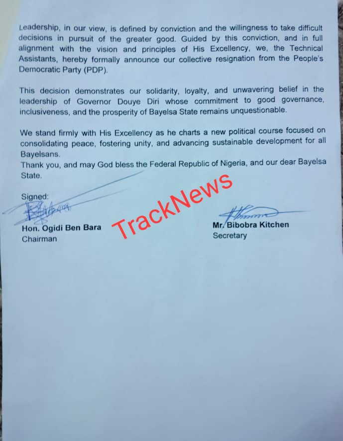 “Our collective resignation from the PDP demonstrates our solidarity, loyalty, and unwavering belief in the leadership of His Excellency, Governor Douye Diri,” the statement read. “We stand firmly with him as he charts a new political course focused on unity and progress for Bayelsa State.”