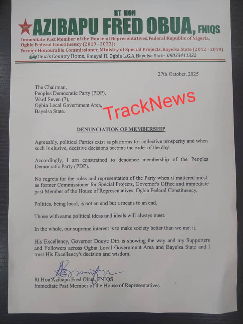 With his formal departure from the PDP, Rt. Hon. Azibapu Fred Obua joins a growing list of Nigerian politicians who have recently re-evaluated their party affiliations amid shifting political priorities. His emphasis on service, loyalty to leadership, and societal progress reflects a broader call for purpose-driven politics within Bayelsa State and Nigeria at large.
