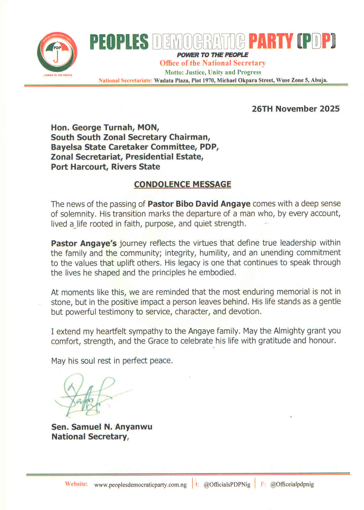 Similarly, the National Secretary of the People’s Democratic Party, Senator Samuel N. Anyanwu, paid glowing tribute to the late Pastor Angaye, noting that his life was “rooted in faith, purpose, and quiet strength.” He emphasized that Pastor Angaye’s legacy of humility, integrity, and service remains an enduring testimony to a life well lived.