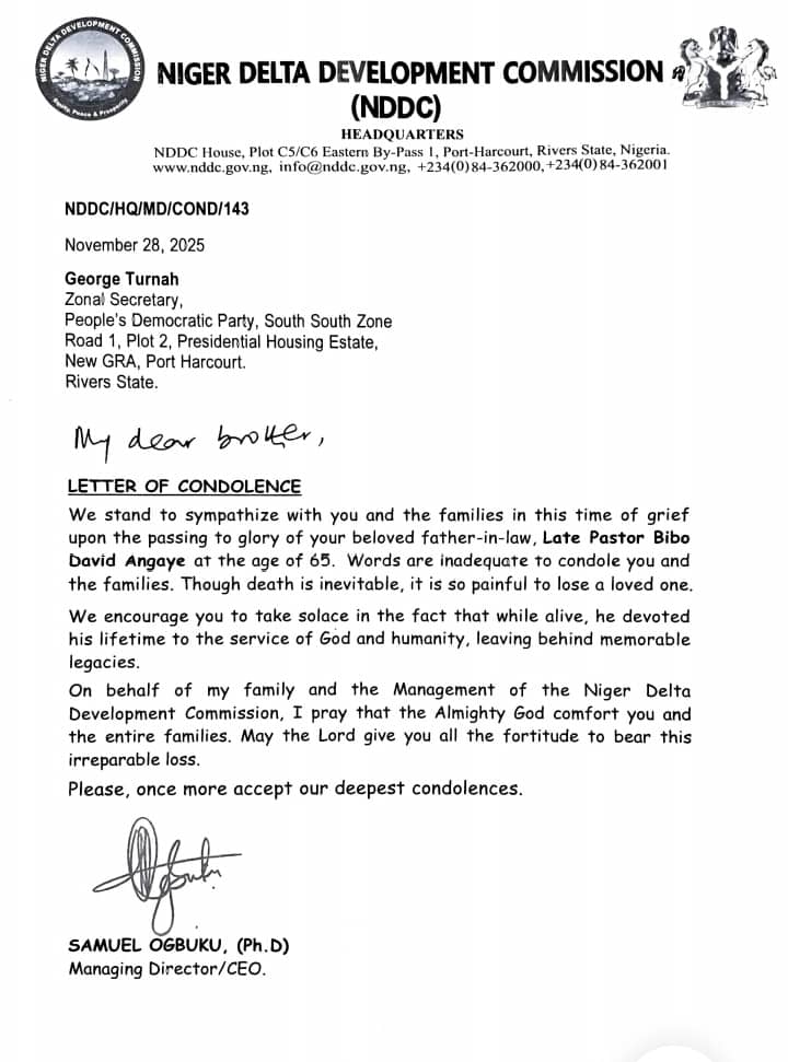 On his part, the Managing Director/Chief Executive Officer of the Niger Delta Development Commission (NDDC), Samuel Ogbuku, Ph.D encouraged the family to take solace in the fact that “while alive, Pastor Angaye devoted his lifetime to the service of God and humanity, leaving behind memorable legacies.” On behalf of his family and the Management of the NDDC, he prayed that the Almighty God comfort