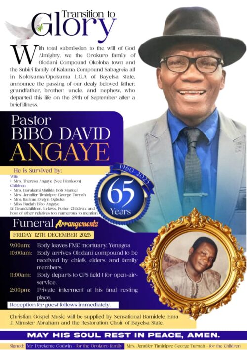 The body of the father-in-law of the Zonal Secretary, People’s Democratic Party (PDP) South South Zone and Chairman, Bayelsa State Caretaker Committee, Hon. Barr. Alabh George Turnah, MON, Late Pastor Bibo David Angaye, will be laid to rest on Friday, December 12, 2025, at his hometown, Okoloba.