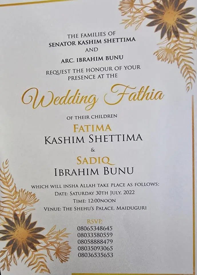 In the wedding invitation which surfaced online, Fatima and her husband-to-be will tie the knot on Saturday, 30th July 2022 in Maiduguri, the Borno State Capital.